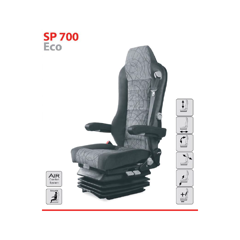Nom de la pièce : Siège pneumatique, passager, ceinture 3pts lombaire pneumatique, tissu , avec accoudoirs, entraxe 260 et coloris noir.